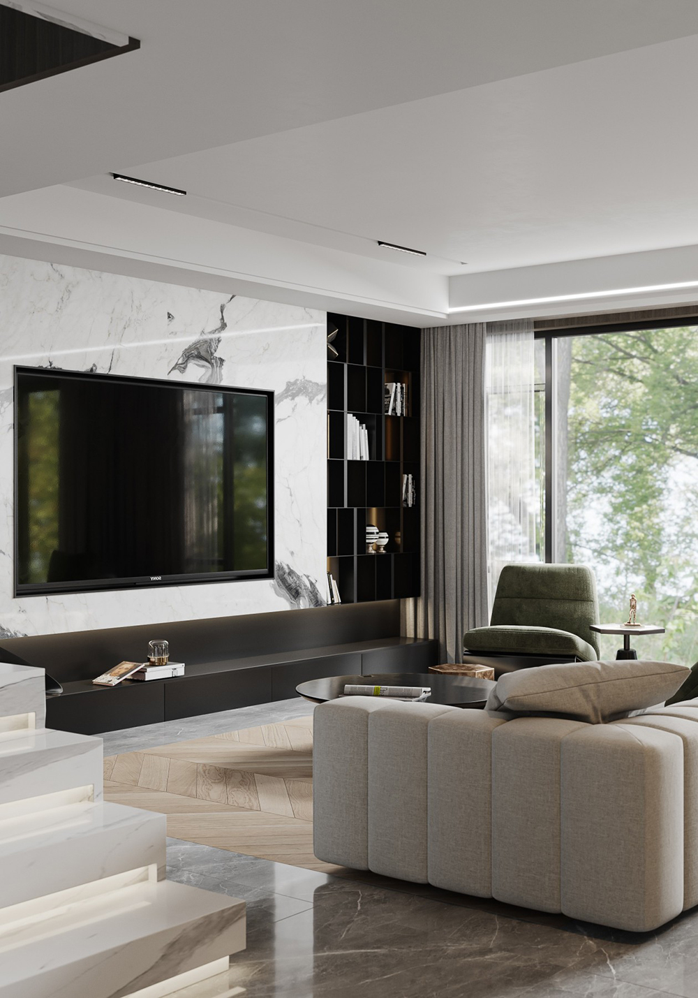 搭配點(diǎn)綴低調(diào)且高貴的綠色調(diào)裝飾豐滿提升空間,但最重要的還是軟裝細(xì)節(jié)處理、空間聯(lián)繫和材料品質(zhì)方面的考究,在合適的位置我們找到空間的統(tǒng)一平衡點(diǎn),將現(xiàn)代輕奢的其他的元素聯(lián)繫起來(lái), 形成統(tǒng)一格調(diào)的高品質(zhì)空間調(diào)性;簡(jiǎn)約中求藝術(shù),化繁為簡(jiǎn),從簡(jiǎn)單舒適中體現(xiàn)生活的精致。