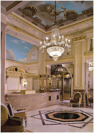 總服務(wù)臺頂面的壁畫具有典型的裝飾作用,搭配金色的線腳和水晶吊燈顯得輝煌大氣